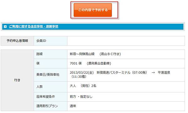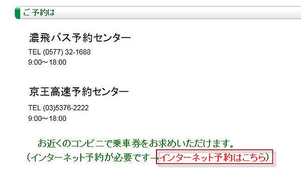 今天要來寫個教學文,先寫個怎麼預定高山到新宿BUS的方法好了!先來到濃飛BUS的網頁找到新宿-高山那條線 : http://www.nouhibus.co.jp/new/exp_bus_shinjyuku.html<--用力給他點下去,網頁下面有好多可以搭配的票。原本我想買白川郷乗り継ぎきっぷ,但學姐去拿票的時候對方卻說這個只能連續兩天用。好吧,那就算了~雖然網頁上都沒有寫明這點....