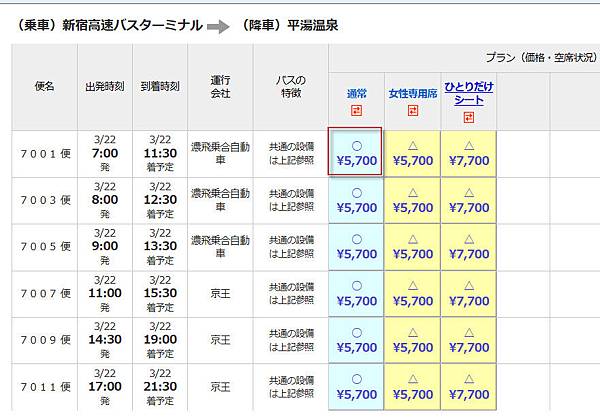 他就會秀出來所有的時刻表跟價錢,想買的時段點下去就是。<三個價格分別是 普通 / 女性專用席 / 一人座,但車上沒有單人座我猜是旁邊沒有人來坐吧~>